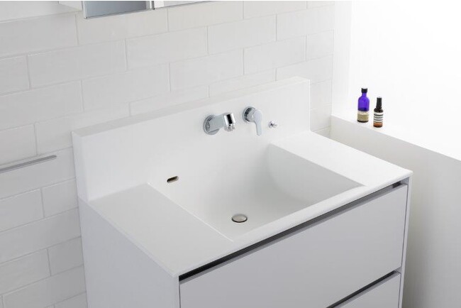 そこで、今回はこれらの特徴である「ハイバックタイプ」と「シームレス設計」を組み合わせ、造作しなくても1台で完結する洗面台《エルフォルム》を開発しました。
