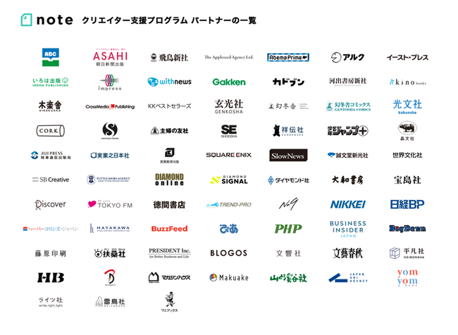 クリエイターが活躍する場を広げるために、 noteがパートナーとともに才能の開花を後押しするプログラム。noteで話題のクリエイターを定期的にパートナーへご紹介。関心を寄せたパートナーからのオファーをクリエイターへ届けます。2021年9月時点で73のメディアがパートナーとなっています。