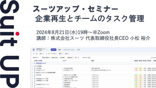 株式会社スーツ(所在地:東京都千代田区、代表取締役社長CEO:小松 裕介)は、2024年8月21日(水)19時から、当社代表の小松が講師を務めるスーツアップ・セミナー「企業再生とチームのタスク管理」を無料開催します。
