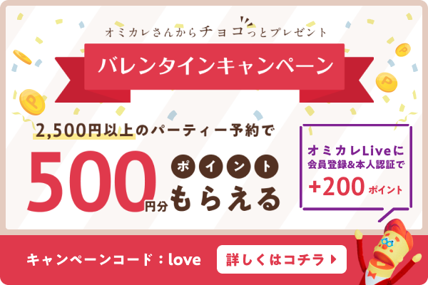 ●パーティーご予約時のキャンペーンコード入力欄に love を入力ください