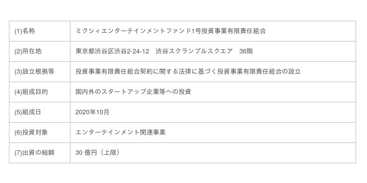 株式会社ミクシィ(東京都渋谷区、代表取締役社長:木村 弘毅)は、エンターテインメント業界におけるデジタルトランスフォーメーション(以下、DX)を、投資活動を通じて推進するファンド「ミクシィエンターテインメントファンド1号投資事業有限責任組合(以下、本ファンド)」の設立が完了したことをお知らせいたします。