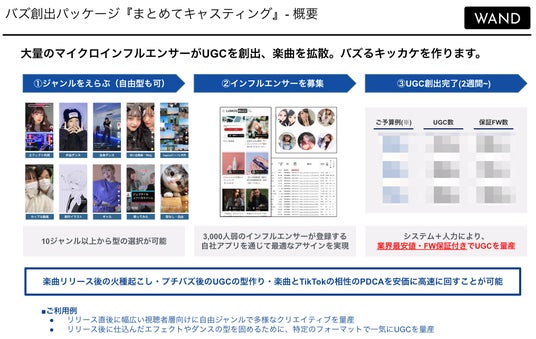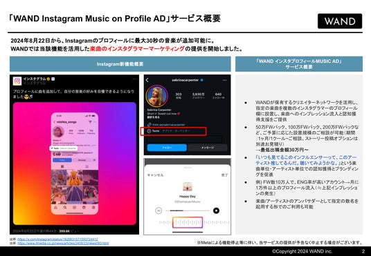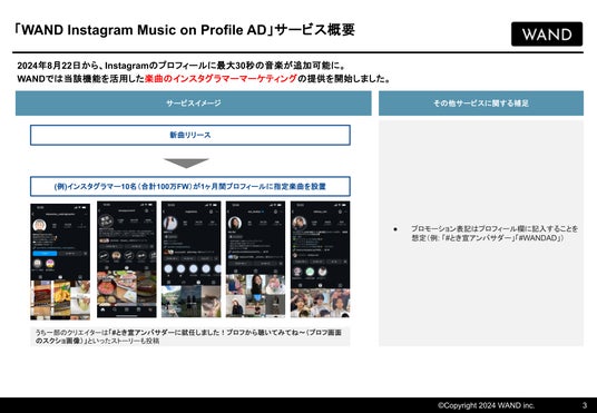 このサービスでは、WANDが保有する5,000人以上のインスタグラマーを含むクリエイターネットワークを活用し、指定の楽曲をインスタグラマーのプロフィール欄に最大30秒間設定します。これにより、楽曲のインプレッション増加と認知度向上を支援します。