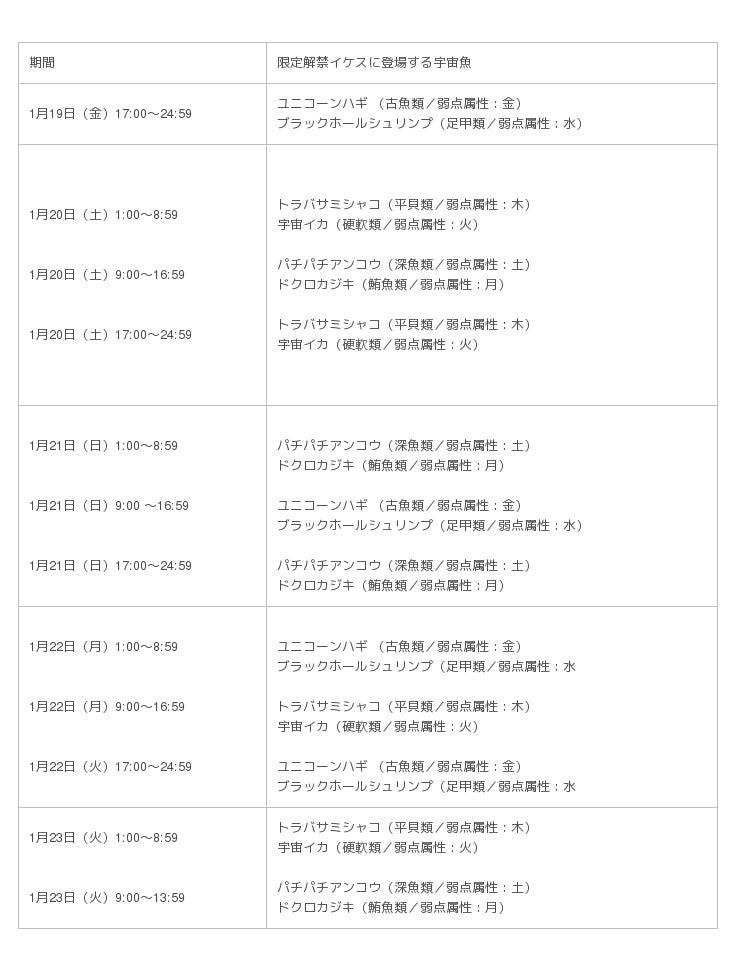 曜日ごとに時間を限定して解禁される「限定解禁イケス」がイケスの内容を変えて、常時開放となり、クリア時にドロップされる高レアリティな進化素材の出現率も2倍となります。