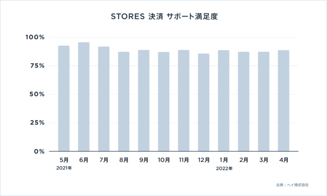 その結果、STORES 決済 が顧客満足度の指標として収集しているアンケート調査では、2022年4月時点で、サポート満足度が12ヶ月平均90%を達成しました。
