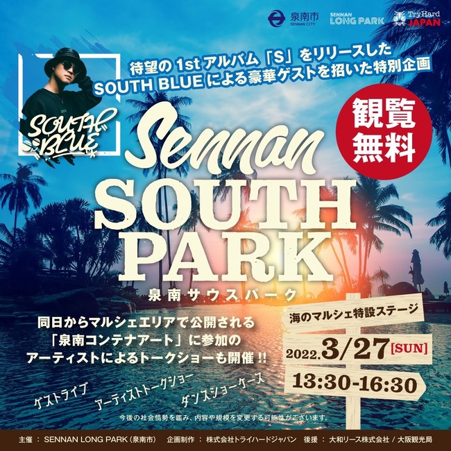 泉南ゆかりのアーティスト「SOUTH BLUE」が企画する音楽イベント「SENNAN SOUTH PARK」がコンテナアート前で同日(3月27日₎に開催されます!イベント内では「SENNANコンテナアートプロジェクト」に参加のBOXER JUNTAROや泉南市在住のCOOK ONE等によるトークセッションも開催予定。今週末は素敵なアートや音楽に触れる1日をSENNAN LONG PARKでお過ごし下さい。