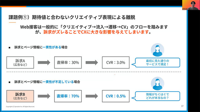 高杉氏は、顧客目線でのCX上の課題は大きく4つあると解説。期待値と合わないクリエイティブ表現による離脱、初回訪問者への説明不足、効率的な商品閲覧ができないこと、そして、サービスの本当の良さに気が付いてもらえないことです。