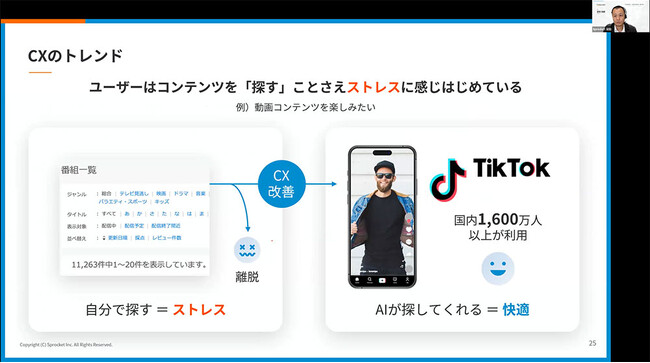 Sprocketの深田は、CXが重要視されている背景に、「スマホやデジタルが当たり前となり、望まれる体験も変わってきている」ことがあると説明。多くの情報から自分で探せるという従来型のネット文化は過去のものとなり、自分で探すのはめんどうだという感覚が大きくなっています。「事業者側の体感と消費者感覚は違うかもしれないという観点でCXを見直す必要がある」と深田は語ります。