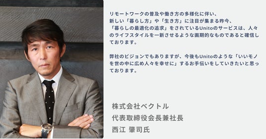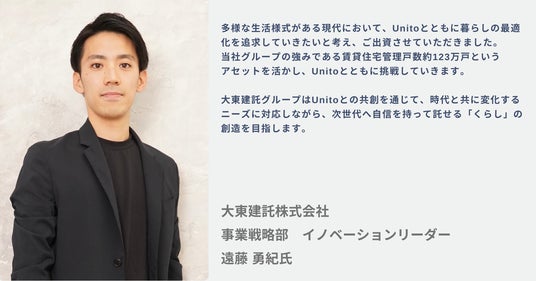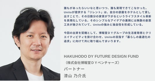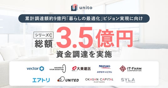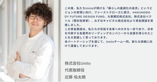 株式会社Unito(本社:東京都千代田区、代表取締役:近藤 佑太朗、以下「Unito」)は、既存投資家の株式会社ベクトルに加え、新規投資家であるHAKUHODO DY FUTURE DESIGN FUND、大東建託株式会社、みずほ成長支援第5号投資事業有限責任組合を引受先とする第三者割当増資により、シリーズCラウンドで総額3.5億円の資金調達を実施したことをお知らせいたします。