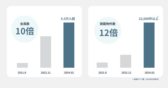 2021年8月よりサービスを開始し、2024年2月時点で物件掲載数は2021年比で12倍の22,000件以上、会員数は5.5万人超を突破しました。Unitoは日本初の「リレント」という仕組みを採用し、先発優位性を築いてきました。自社にてホテル再構築事業の機能も有しており、直営ホテル物件454室の売上も堅調です。