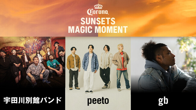 今年より新プロジェクトとしてスタートした“サンセットタイムに聴きたいリラックスミュージック”を発掘する「CORONA SUNSETS MAGIC MOMENT」の選考が終了し、”宇田川別館バンド”、”peeto”、”gb”の計3組のアーティストがファイナリストとして選出されました。実行委員会による書類選考を通過した3組のアーティストは、サンセットを感じるロケーションでミュージックビデオを撮影し、本日よりミュージックビデオ公開および一般投票を開始します。