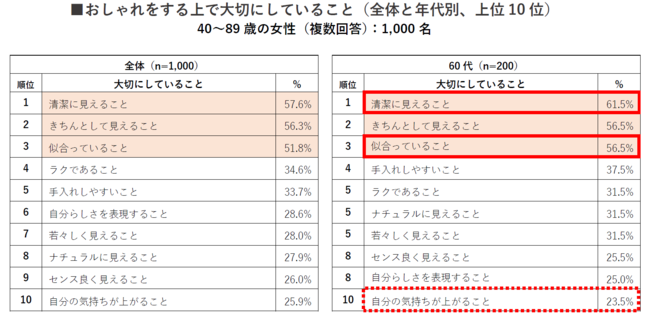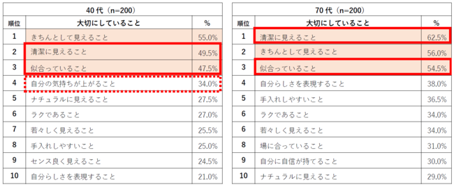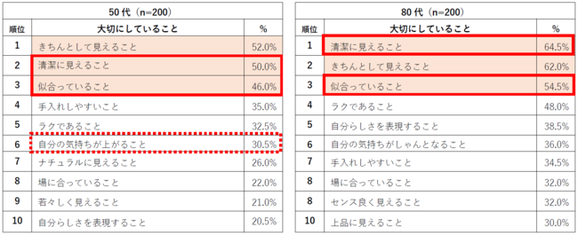・「清潔に見えること」「きちんとして見えること」「似合っていること」は、すべての年代でTOP3に入った。年代差を見ると、40代、50代では「自分の気持ちが上がること」、60~80代では「清潔に見えること」「似合っていること」が他年代比で高かった。