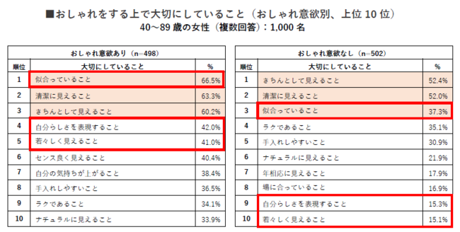 ・「おしゃれをする上で大切にしていること」をおしゃれ意欲の高さでも比較した。その結果、「おしゃれ意欲あり」は「おしゃれ意欲なし」より、「似合っていること」「自分らしさを表現すること」「若々しく見えること」が20ポイント以上高かった。