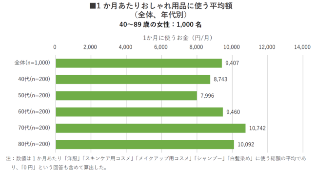 ・40~80代女性に1か月あたりおしゃれ用品(※3)に使う金額を尋ねた。その結果、全体の平均額は9,407円/月だった。