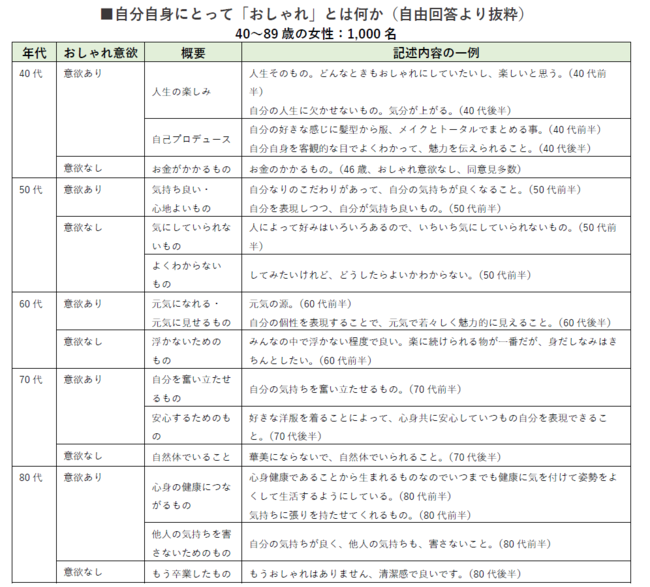 ・「あなたにとっておしゃれとは何か?」を自由記述で聞いたところ、40代の「おしゃれ意欲あり」では、「人生の楽しみ」「自己プロデュースの手段」、「おしゃれ意欲なし」では「お金がかかるもの」といった声があがった。また、80代「おしゃれ意欲あり」では「心身の健康につながるもの」「他人の気持ちを害さないためのもの」、「おしゃれ意欲なし」では「もう卒業したもの」といった意見が見られ、世代と「おしゃれ意欲」の高さで違いが見られた。