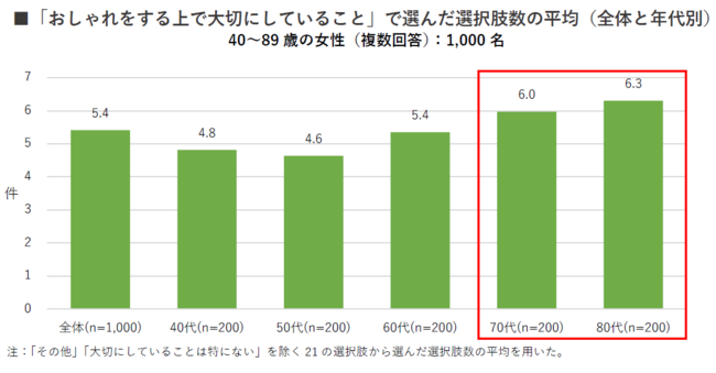 ⇒「おしゃれをする上で大切にしていること」で選んだ選択肢数の平均は、全体で5.4件。年代別で比較すると、70~80代の選択肢数平均は6件以上で、他年代比で多かった。