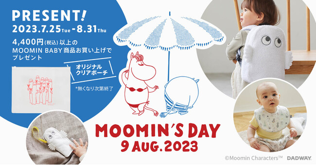 ダッドウェイでは、本日7月25日よりノベルティキャンペーンを実施。『MOOMIN BABY』の商品を税込4,400円以上ご購入いただいた方にクリアポーチをプレゼントいたします。ニョロニョロがデザインされた、ダッドウェイ限定のノベルティです。中身が見えて使いやすく涼し気なポーチは、夏の楽しいお出かけのお供におすすめです。