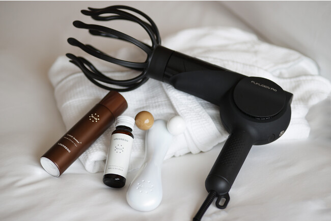 アメニティは、人の持つ本来の美しさを追求する「LOUVREDO」によるラインナップで、第一弾でも翌朝のお肌のやわらかさを実感されるお客様が多かった 飲む美容液「レヴィ インナーエステメルモ」の他、手軽に炭酸ケアを愉しめる「レヴィ ミストローション」、エステティシャンのハンド技術を再現したボディマッサージローラー「レヴィ ソフィル-e ホワイト」などをご用意。中でも注目したいのは、低温の風で、髪だけでなく顔や身体にまで使える「復元ドライヤーPro」で、サウナの間に愉しむ外気浴の代わりに全身にあててボディケアするのがおすすめです。