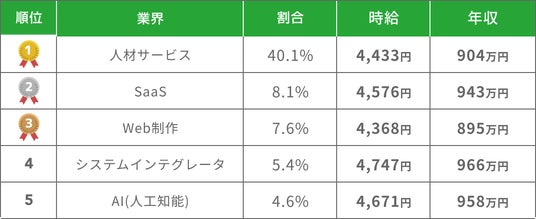 フリーランスエンジニア案件数TOP5の業界と平均年収・時給