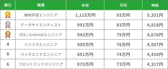 ・職種別では機械学習エンジニアが年収1,115万円で1位