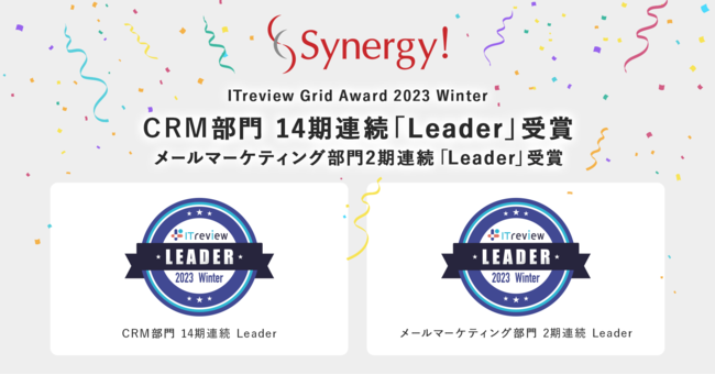 シナジーマーケティング株式会社(以下当社)は、当社が提供するクラウド型サービス「Synergy!(シナジー)」がアイティクラウド株式会社(本社:東京都港区、代表取締役社長:黒野源太)運営のIT製品レビュープラットフォーム「ITreview(アイティレビュー)」において、満足度、認知度ともに優れた製品であると評価され「ITreview Grid Award 2023 Winter」CRMおよびメールマーケティング部門において最高位「Leader」を受賞したことをお知らせします。CRM部門における「Leader」受賞は14期連続となります。