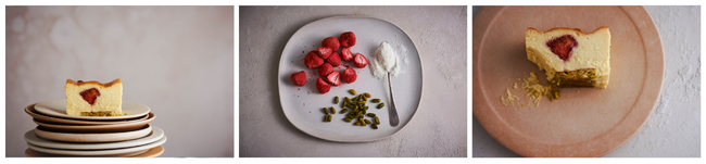 ピスタチオをふんだんに使用した濃厚なジェノワーズとドライストロベリーを合わせ、味わいに変化をつけたリッチなフレーバー。隠し味に抹茶を加え、ピスタチオの青い香りやいちごのフレッシュさを際立たせました。ケーキの底には、ピスタチオとバターと卵で作った「モワルー」という滑らかで香ばしい生地を敷き、よりナッツの香りをご堪能いただけるように仕上げています。ピスタチオの濃厚な味わいといちごの酸味を感じられる全解凍でお楽しみください。