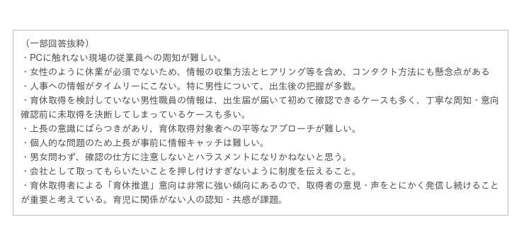 個別周知や意向確認に関する課題全般を問う設問では、「男性については出生後の把握が多数」「男性の場合、対象者の情報をどうキャッチしていくかが課題」等、特に男性について対象者の把握に関するコメントが見られました。その他、PCに触れない従業員への周知、上長の意識の差によるアプローチの平等性に課題を感じているとの声も上がっています。