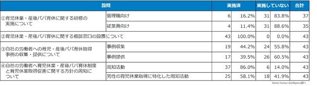 株式会社Works Human Intelligence(本社:東京都港区、代表取締役最高経営責任者:安斎富太郎、以下 WHI)は、統合人事システム「COMPANY」のユーザーである大手法人を対象に、2022年4月に施行された育児・介護休業法に準じた取り組みおよび男性育休に関する全38問にわたる状況調査を実施し、43法人から回答を得ましたので調査結果をお知らせします(調査期間:2022年6月15日~2022年7月8日)。