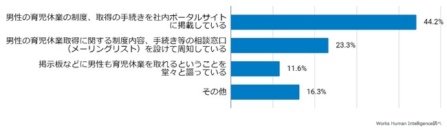男性の育児休業取得に特化した周知活動を問う設問では、「男性の育児休業の制度、取得の手続きを社内ポータルサイトに掲載している」という回答が最も多く、次いで「相談窓口の設置や周知」という結果。一方、「男性に特化した案内はない」「男女の区別なく案内」というコメントも複数得られた。