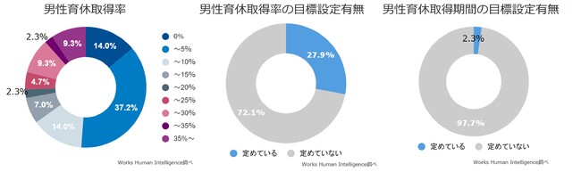 また、男性育休取得率の目標設定有無については、現時点で3割弱(27.9%)が目標設定有りと回答した一方、取得期間については、ほとんどの法人で目標を定めておらず、設定しているのは1法人のみ(2.3%)という結果となりました。