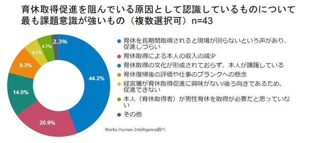 また、上述の調査結果に記載した設問の他、「男性の育休取得に関する意識」について聞いた設問では「本人が希望するなら法定なので仕方ない」という回答も多く見られました。育休取得促進を阻んでいる原因では、最も課題意識が強いものとして半数近くの法人が「育休を長期間取得されると現場が回りづらいという声があり、促進しづらい」と回答し、これが育休を取得しようとする側にとっては「育休取得の文化が形成されておらず、本人が躊躇している」という課題意識にも繫がっていることがうかがえます。