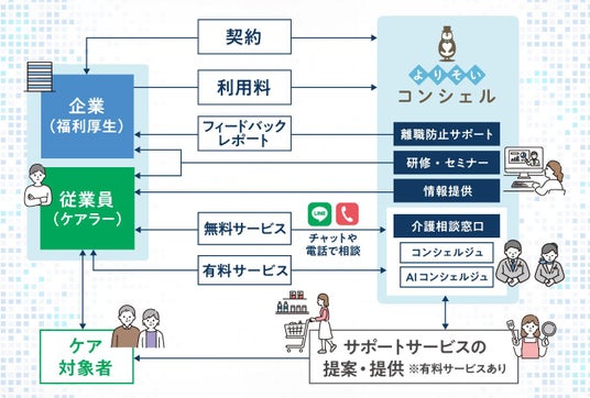 そこで介護事業に40年以上携わってきた豊富な経験と実績を持ち、現在も月に約8万人の利用者に介護サービスを提供している当社は、そのノウハウを生かして、企業とビジネスケアラーが抱える介護離職の問題を解決するために、契約企業とその従業員の双方に最適な支援を提供する、仕事と介護の両立支援サービス「よりそいコンシェル for Business」の開発をおこないました。