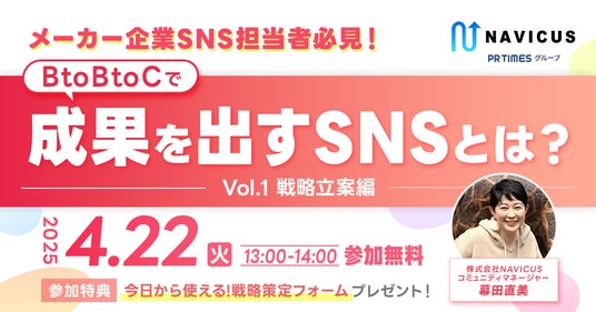 SNSを通じて企業様や地方自治体様のコミュニケーション支援サービスを提供する株式会社NAVICUS(本社:東京都千代田区、代表取締役:武内 一矢、以下:NAVICUS)は、2025年4月22日(火)に無料ウェビナー「メーカー企業SNS担当者必見!BtoBtoCで成果を出すSNSとは?~Vol.1 戦略立案編~」を開催いたします。
