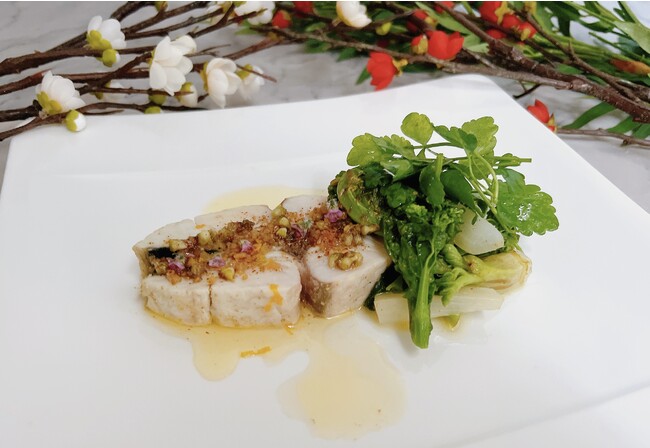【鰆のロースト ふきのとうを加えた焦がしバターソース 春の山菜エチュベ添え】
