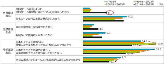 次に、住宅ローンの繰上返済をした理由についてお伺いしました。理由として、1.“利息を減らしたい”や“返済期間を短縮したい”、“当初の返済スケジュールよりも効率的に減らしたい”といった「早期返済起点」の理由、2.“「住宅ローン」の心理的負担から早めに解放されたい”、“できるだけ早めに完済し、自身の完全所有物にしたい”といった「心理的起点」の理由は、足元10年(住宅ローンの借入時期:2014年~2023年)で大きく減少していることが分かりました。