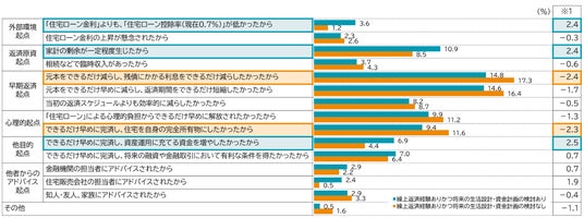 *回答者:住宅ローン繰上返済利用経験者 *それぞれの回答総数に対する各選択肢回答数の割合にて算出 *回答者数:<繰上返済経験ありかつ将来の生活設計・資金計画の検討あり>599、<繰上返済経験ありかつ将来の生活設計・資金計画の検討なし>625 ※1[(繰上返済経験あり)かつ(将来の生活設計・資金計画の検討あり)]-[(繰上返済経験あり)かつ(将来の生活設計・資金計画の検討なし)]の値を掲載