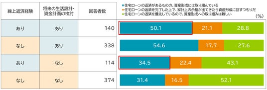 ●実際、「住宅ローン返済の負担感」や「資産形成との両立」においても、「繰上返済経験あり×将来の生活設計・資金計画なし」は上記同様に劣後している