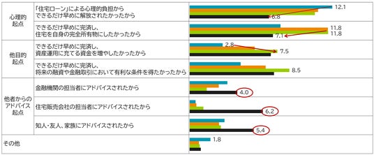 実際に、「繰上返済経験あり×将来の生活設計・資金計画あり」の人と「繰上返済経験あり×将来の生活設計・資金計画なし」の人の繰上返済理由を確認したところ差があり、差が大きい項目としては、前者は「外部環境」「返済原資」「他目的」起点の客観的な理由、後者は「早期返済」「心理的」起点といった主観的な理由があげられました【図表6】。