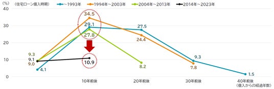 *回答者:住宅ローン利用経験者 *回答者数:<~1993年の借入れ>356、<1994年~2003年の借入れ>781、<2004年~2013年の借入れ>779、<2014~2023年の借入れ>823