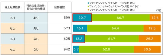 将来の生活設計・資金計画の検討有無、いわゆるライフプラン・マネープランの検討状況を勘案すると、ファイナンシャル・ウェルビーイング度が高い人の割合は、「繰上返済経験あり×将来の生活設計・資金計画なし」では13.2%となっており、「繰上返済経験あり×将来の生活設計・資金計画あり(20.7%)」だけでなく「繰上返済経験なし×将来の生活設計・資金計画あり(16.1%)」よりも劣後する結果でした。