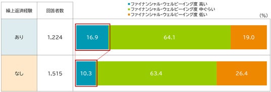 繰上返済経験の有無別にファイナンシャル・ウェルビーイング度を確認したところ、「繰上返済経験あり」では「高い」が16.9%、「繰上返済経験なし」では「高い」が10.3%と、前者の方が「ファイナンシャル・ウェルビーイング度が高い」人が多いことが分かりました【図表4】。