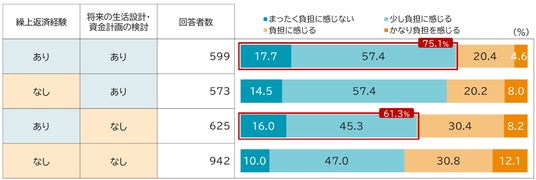 ファイナンシャル・ウェルビーイング度の分布と同様、「繰上返済経験あり×将来の生活設計・資金計画なし」では、住宅ローン返済を負担に感じる方が多く、資産形成と両立のできている人は少ないことが分かりました。