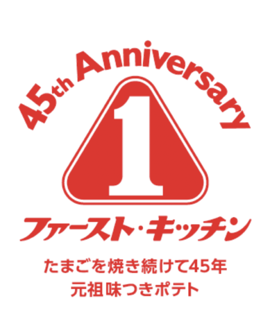 2005年まで約20年間使用されたロゴは「おにぎりマーク」や「さんかくいち」と呼ばれ親しまれました。 45周年の節目に、これからも初心の心を大事にしていきたいという想いを込めて、このロゴを1年間の期 間限定で復刻させることを決めました。また、45周年の記念としてファーストキッチンが創業当時から販売しているベーコンエッグバーガーにちなみ、ロゴに「たまごを焼き続けて45年」のメッセージを加えました。さらに、幅広い世代に親しまれている味付きポテト(フレーバーポテト)は、当社が元祖であることを改めて知ってもらうためのメッセージも込めました