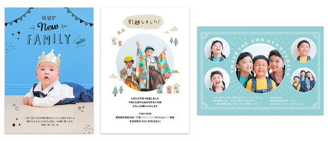 出産・引越し報告のほか、感謝の気持ちを伝えるThank youレターや暑中見舞いなどさまざまなシチュエーションのはがきが取り揃えられており、カジュアル・シンプル・和風など、様々なテイストの中からご希望のデザインをお選びいただけます。さらに、手書き文字やスタンプを加えたオリジナルデザインで作成することも可能です。