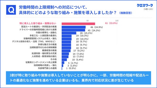 労働時間の上限規制への対応状況を調査したところ、物流事業者の33.0%が『特に取り組みや制度は導入していない』と回答し、対応が遅れている現状が明らかになりました。