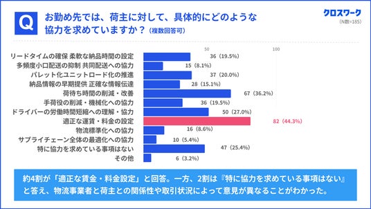 Q「お勤め先では、荷主に対して、具体的にどのような協力を求めていますか?」に対する回答を表したグラフ(複数回答:n185)
