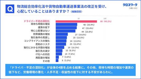 Q「物流総合効率化法や貨物自動車運送事業法の改正を受け、心配していることはありますか?」に対する回答を表したグラフ(複数回答:n185)