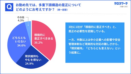 一方で、『どちらともいえない』と回答した事業者34.6%にのぼり、そのうち約3割は『すぐに判断を下すのではなく、時間をかけて検討したい』と答えており、是正の必要性を感じながらも、現実的な対応の難しさから判断を保留している事業者が多いことがわかります。