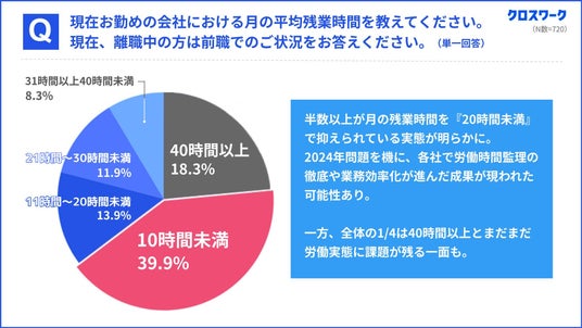 Q「現在のお勤めの会社における月の平均残業時間を教えてください」に対する回答を表したグラフ(単一回答:n720)