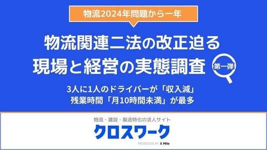 ノンデスク事業者向けの人材採用システム『クロスワーク』を提供するX Mile株式会社(読み:クロスマイル、本社:東京都新宿区、代表取締役:野呂 寛之、以下『当社』)は、物流業界の働き方に関する実態調査として『クロスワークしごと白書2025』をリリースしました。第一弾となる本リリースでは、全国の物流事業者の経営者・役員の方185名およびトラックドライバー720名(※1)を対象とした、『物流2024年問題』による収入・働き方の変化および、2025年4月1日から開始する『物流関連二法(※2)』への対応実態に関する調査結果を発表します。