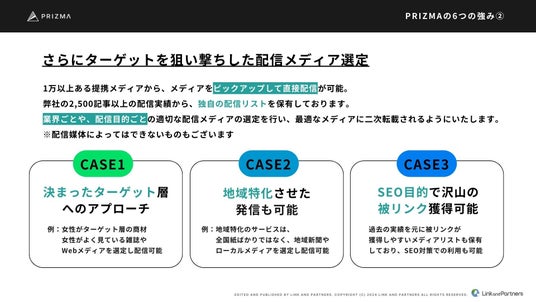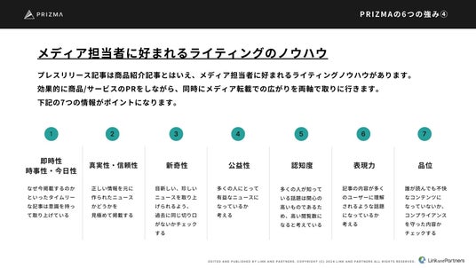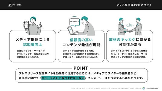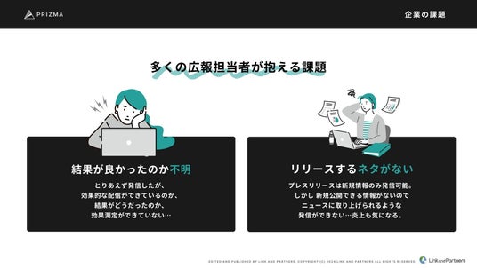 企業のPR支援プロダクト「PRIZMA」ブランドを展開する株式会社リンクアンドパートナーズは、創業以来、1,000社以上の企業様のPRを支援してまいりました。この度、これまでのPR支援のなかで培ったノウハウ・ナレッジを企業のプレスリリース配信の効果最大化のため『PRIZMA|プレスリリースコンサルティングサービス』の提供を開始しました。